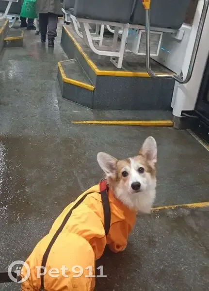 Собаки потеряшки, Москва, фото: Потеряшка собака, метро «Тульская», Москва - щенок корги в оранжевом комбинезоне