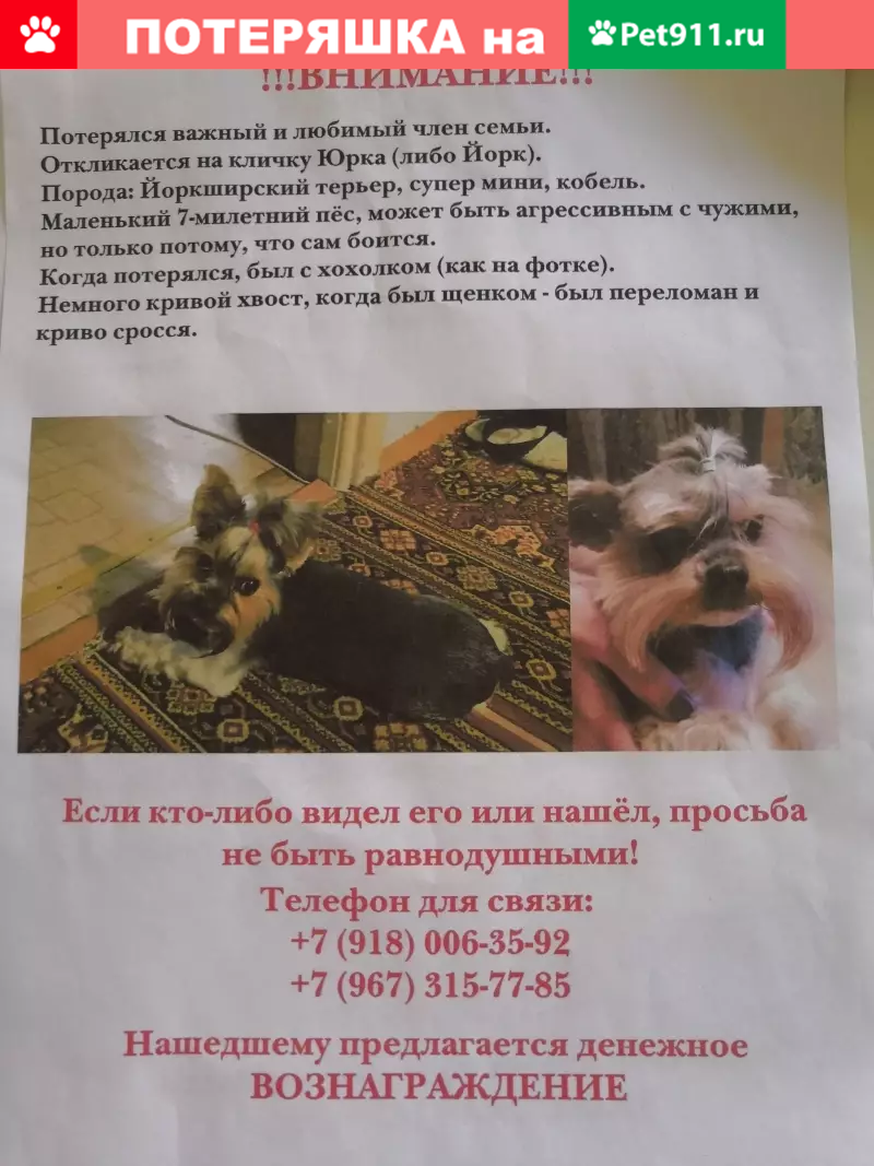Пропала собака йорк по адресу...