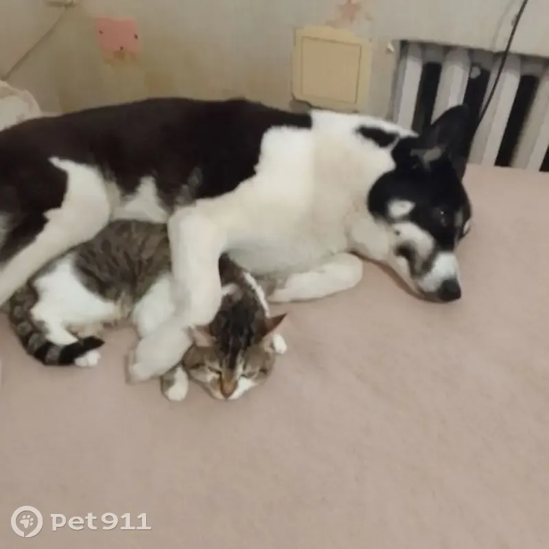 Черная с белым. Метис хаски. Любит кошек. Спи...