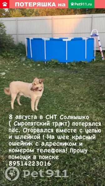 Потерялся кобель. Зовут Балу. В Омске СНТ СОЛ...