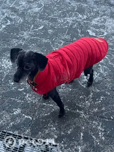 Собака черная, "пальтишко" красное. Есть ошей...