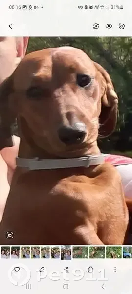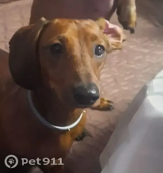 Коричневая такса- Пуля, серый ошейник, пуглив...