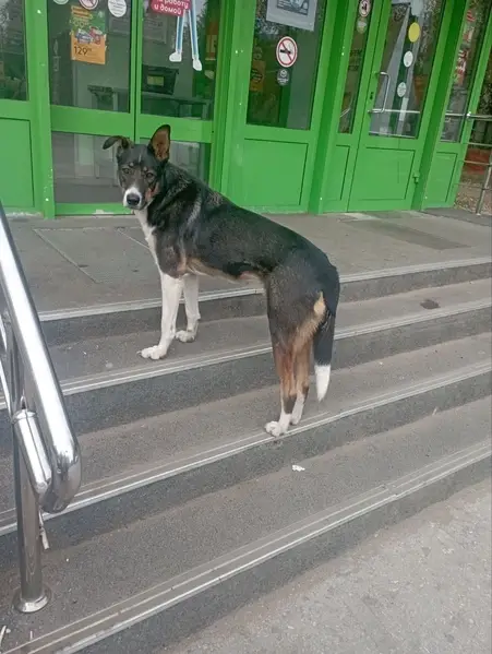 Ноги белые, морда чёрная, окрас в основном чёрный с коричневым, грудь белая. Уши и хвост купированы. Возраст 6 лет и 7 месяцев, крупная, помесь алабая. Добрая собака, при встрече на улице с людьми виляет хвостом. Вечером гуляла с мужем, сын пошёл к репетитору в сторону улицы Ленина по улице Осипенко, собака побежала за ним. Он ей сказал, или на место и всё, больше мы её не видели.