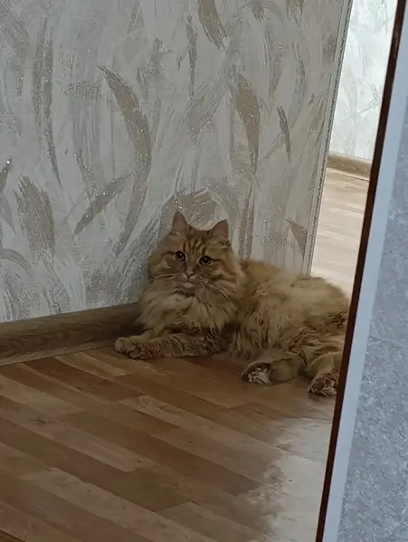 Рыжий кот, большой. Ехали по трассе, лес кругом и он вышел на дорогу. Видно домашний, очень умный, ласковый. В машине вёл себя хорошо, привычно ему было. Не кастрирован, весь рыжий, только подбородок немного белый