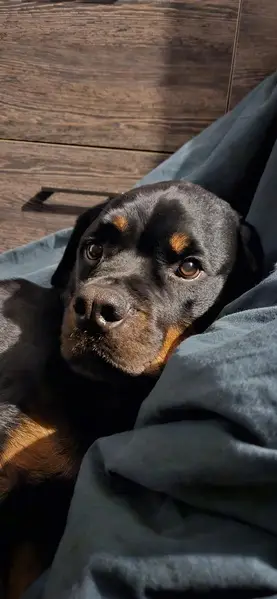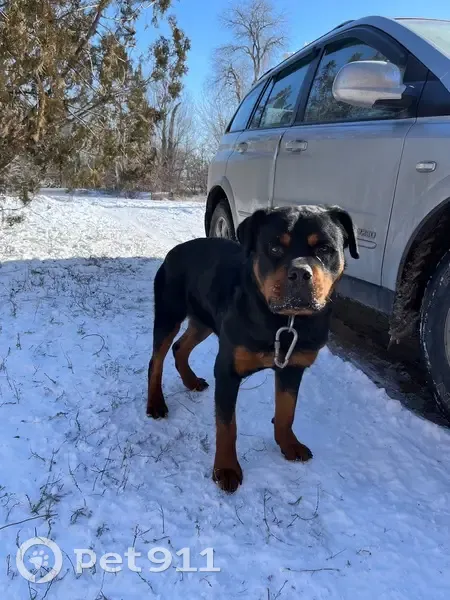 Нашли собаку сегодня утром (20 февраля) рядом с нашим домом (г. Волгоград, станция Чапурники) Порода Ротвейлер, особь ещё не взрослая. Есть шлейка и карабин - видимо, от цепи. Окрас чёрно-коричневый.