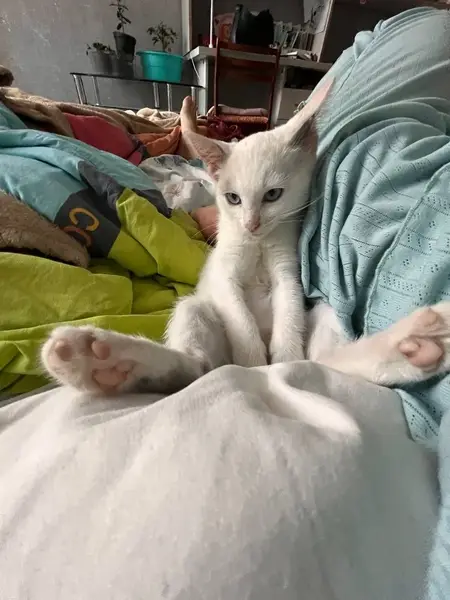 Найден котенок белого окраса с чёрными пятнышкамы на хвосте, около ушка и на копчике. По видимому ему около 6-8 месяцев. Очень ласковый и чистый кот, ухоженный. Ходит в лоток, скорее всего домашний. Был дождик, видимо заплутал и не смог добраться до дома, на руки сам забрался. Просьба обращаться по телефону 89526454035