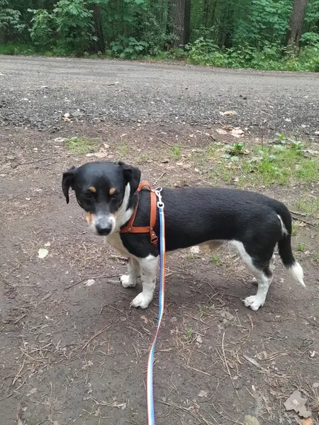 черная с белыми пятнами, среднего размера, худая, очень ласковая. Вырвалась и убежала за чужой собакой