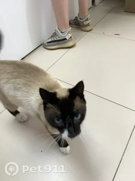 Есть ошейник, просто на фото не виден, постоянно мяукает, голубые глаза, как будто черная маска на лице также на лице белый цвет около носика, и темные оттенки, тело светлое, хвостик черный, сами лапки белые.