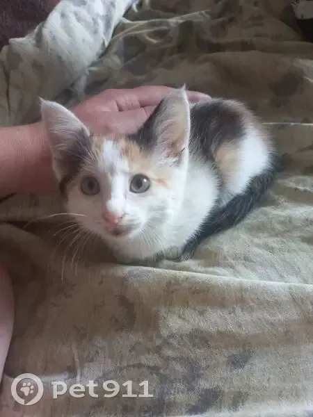 Трехцветная кошка. Котёнок. Возраст неизвестен. Весь вечер плакала под окном. Истощенная и грязная. Помыли, избавились от блох, покормили. Ищет хозяина. Оставить не можем. 2 взрослые кошки дома.