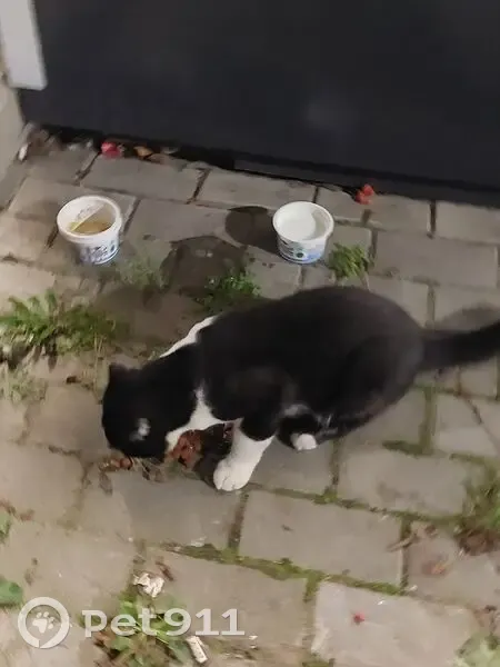 Видно что потерялся котик вислоухий черно-белый мордочка разделена по половине по цвету. Очень пугливый и голодный, видно, что впервые на улице. Но человека не боится, подходит