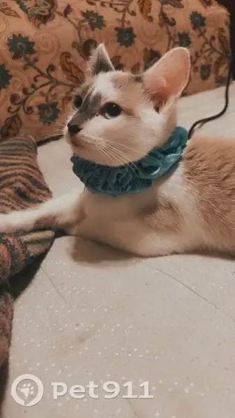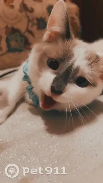 She is 7 months old female with blue eyes and black tail her 1 ear is black and 1 is white her colour is white with brown patch’s on her she was at home we live on 8 th floor may be she have sneaked out Ей 7 месяцев, девочка с голубыми глазами и черным хвостом, у нее 1 ухо черное и 1 белое, окрас белый с коричневыми пятнами, она была дома, мы живем на 8-м этаже, возможно, она улизнула тайком.