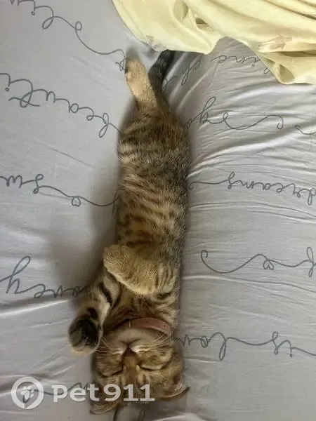 Вислоухая,спинка в полоску чёрная, животик в чёрное пятнышко, кремово- коричневая с добавлением серого цвета, котёнок, на ней розовый ошейник с колокольчиком