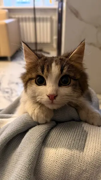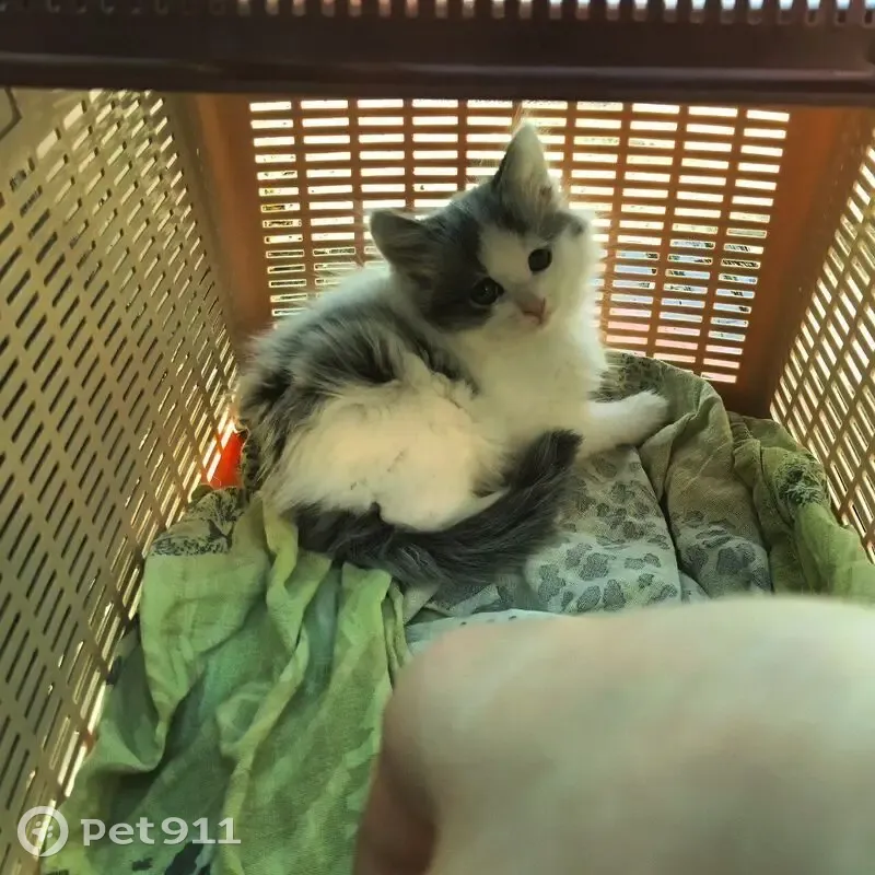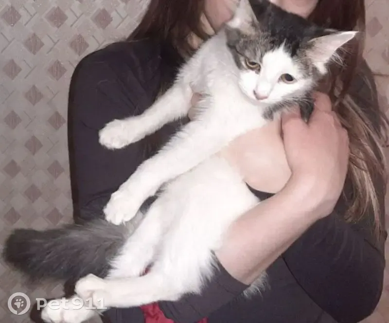 Окрас бело-серый , пушистая , полудлинная шерсть, в некоторых местах темная. Имеет пушистый, серый хвост и выразительные глаза. На голове серые пятна и на мордочке , остальная мордочка белая.