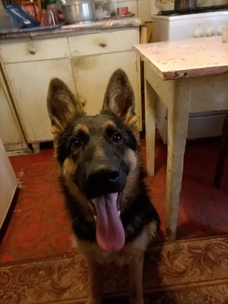 Внешняя сторона туловища вся чёрная, внутри рыжая, голова и морда тоже рыжая, большие уши, слегка вытянутая морда, на концах лап белое пятно. Фиолетовый ошейник и чёрный намордник.