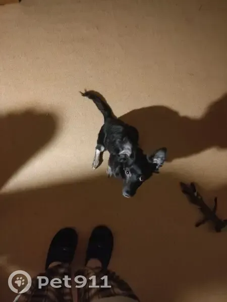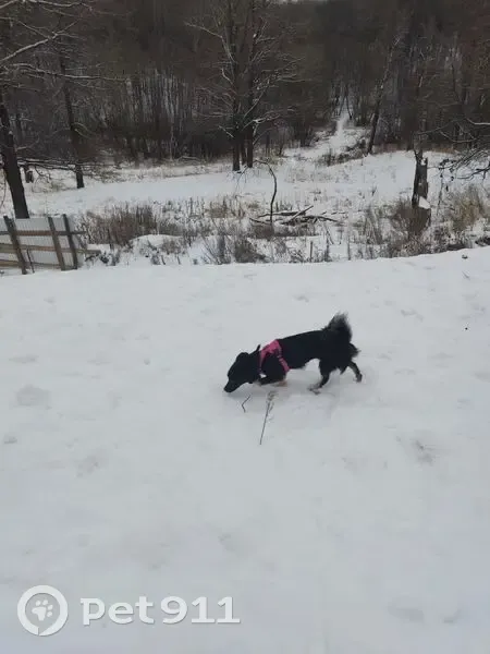 Черненькая собака, с белыми лапками. Очень шустрая и прыгучая, громкая и боится людей. Катались на лыжах в лесу убежала за другим лыжником искали, но не нашли.