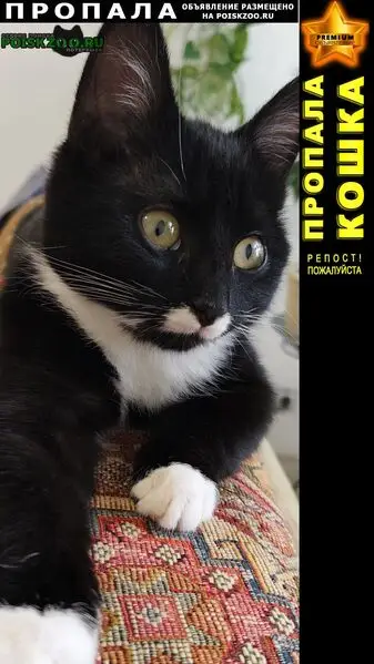Черно-белый, мальчик, явно домашний, шерсть лоснится, красивая, ухоженная, глаза чистые. Людей не боится, бежал за нами как собачка. К лотку приучен, разговорчивый.