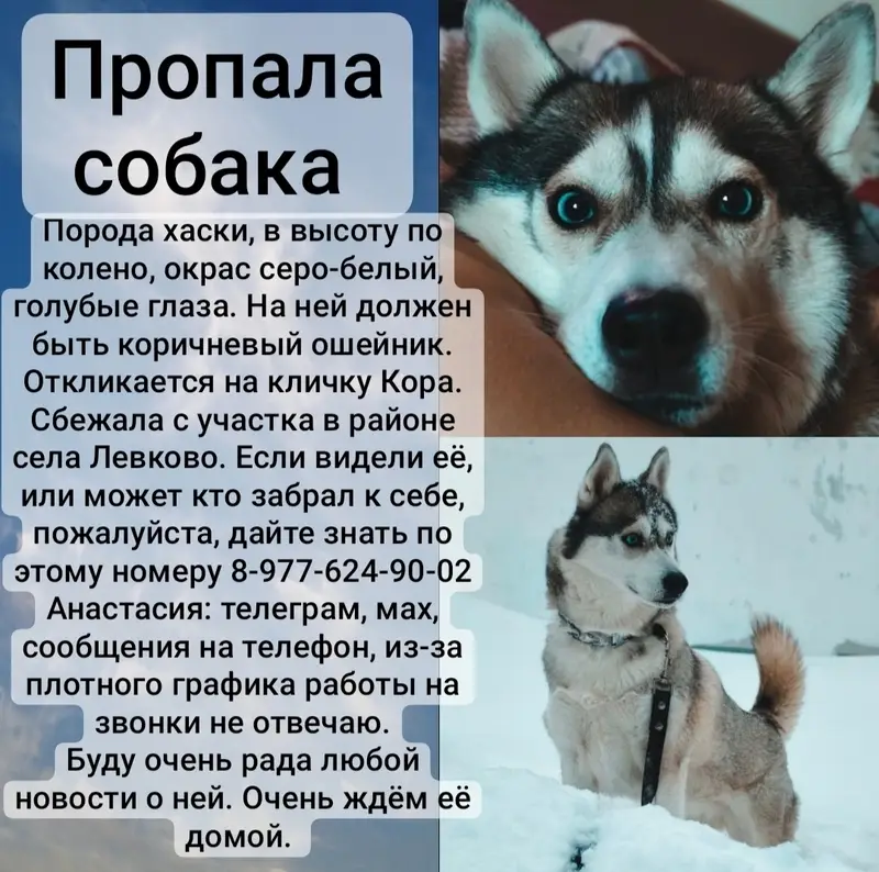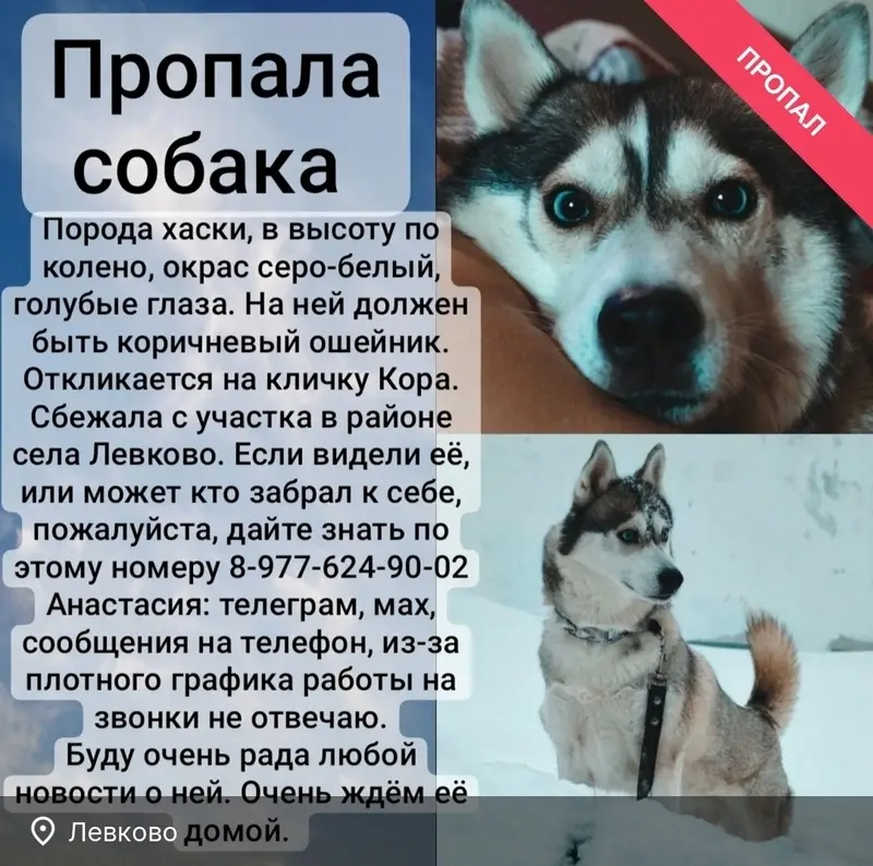 Трасса м-2 (Симферопольское ш.) в районе 1-го съезда на Чехов (от Москвы) найдена сучка похожая на хаски. Судя по увеличенной петле, собака недавно была или в данный момент - в течке. Возраст (состояние зубов) молодой (около 1-2 лет)… Была без ошейника. В машине вела себя хорошо. Контактная