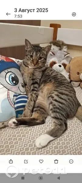 Молоденькая кошечка , пестренькая в точеску на боках и животике, нос рыжий, уши большие, мама ориентал. Довольно крупная. На задних лапках "белые носочки "