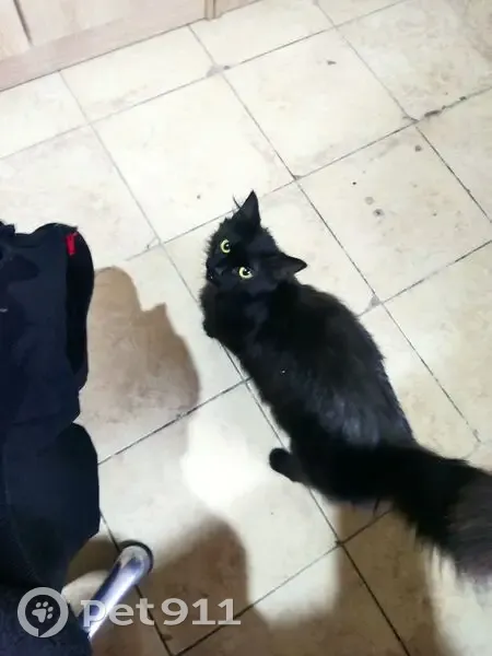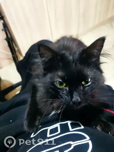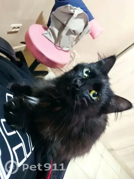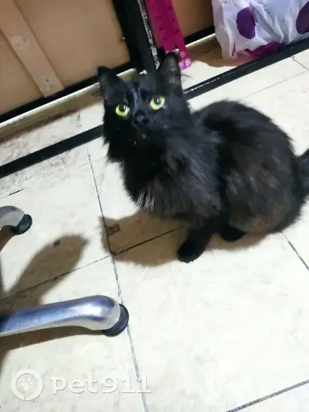 Черная с тёмно-коричневый кошка, на груди белое пятнышко. Очень пушистая, пушистый хвост с редкими белыми волосками. Очень худая, но явно ухоженная, видно, что домашняя! Невероятная ласковая, сперва пугалась, теперь полдня на руках мурчит! К сожалению, себе оставить не могу.