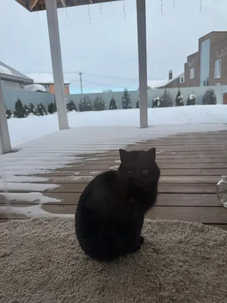 Черный котёнок подросток,чистенькой и сытый.Явно домашний