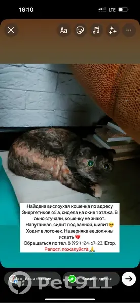 Найдена вислоухая кошечка по адресу Энергетиков 65 а, сидела на окне 1 этажа. В окно стучали, кошечку не знают. Напуганная, сидит под ванной, шипит Ходит в лоточек. Наверняка ее должны искать