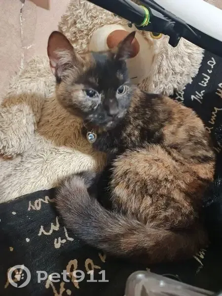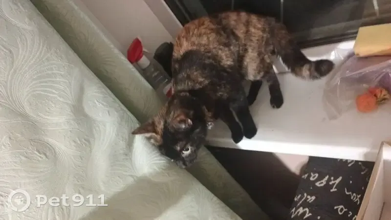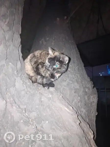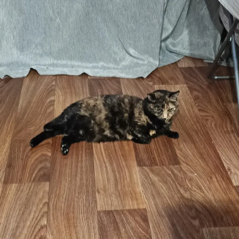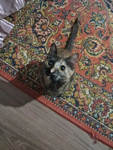 Окрас трёхцветный (еще называют таких черепашки), цвет глаз стандартный зелёный. В руки пошла не сразу, но попав в квартиру быстро освоилась и начала мурлыкать, не прекращая. Предположительно что-то с горлом или дыхательными путями, т. К. Очень часто кашляет и мяукает беззвучно (возможно просто сорвала). Есть ошейник с сердечком. Забрали пока что к себе, но оставить не можем из-за соображения безопасности своих животных.