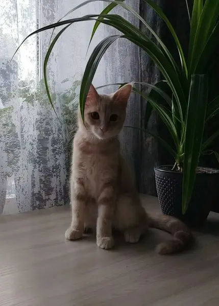 Рыжий, пузико, лапки - белые, хвост с полосочками, желтые глаза, розовый нос. Приблизительно 2-3 месяца.