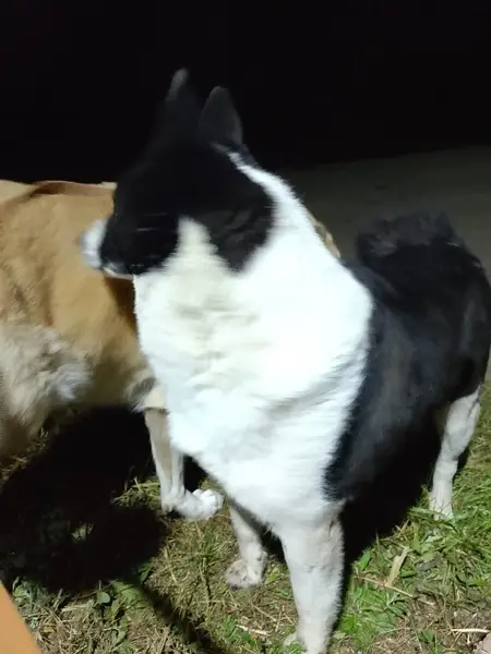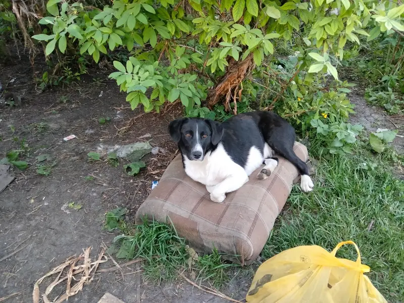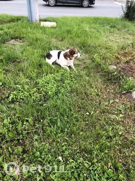 Окрас белая,чёрное пятно на правом боку,ушки стоят;2.09 лежала на газоне напротив ТК Кировский,с ошейником,пугливая,бегает вдоль Проспекта победы до Касленской и обратно,глаза грустные