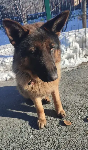 Кобель овчарка. Молодой. Игривый. В ошейнике. Пахнет квартирой, не будкой. Увязался за нами (мной и моей собакой) ушёл далеко в посёлок к нам. Держу во дворе пока. Клеймо не могу посмотреть, пытается руки грысть мне игриво, но опасно.