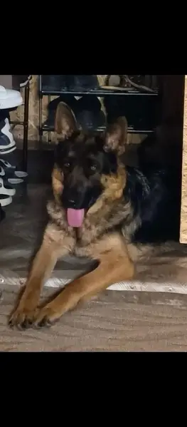 Немецкая овчарка, с ошейником. Очень добрая, умная, ухоженная.