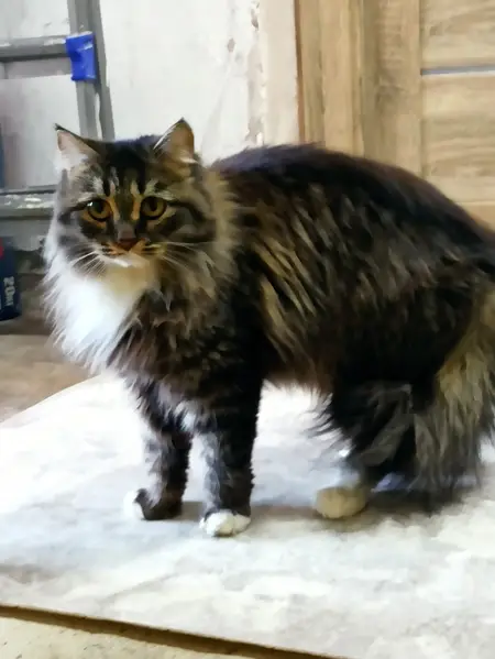Крупных размеров, мраморного окраса, уши деформированы, с кисточками, зелёный ошейник. Кошка стерилизована, чипирована!
