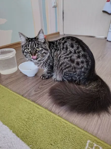 У кота серьезная болезнь с сердцем, требуется длительное лечение. Приметы: Большой пушистый хвост, полосатый окрас тёмно-светлый. Кисточки на ушах. На животе кудрявая шерсть. Он не очень ласковый
