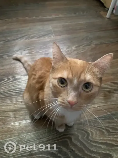 Рыжий окрас с белыми пятнами на животе, шее и лапах. Выбежал из подъезда во время переезда на новое место