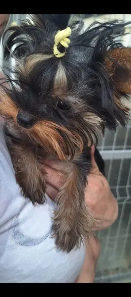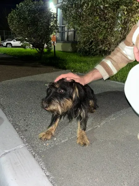 Чëрный, голова с сединой, маленький, порода Йорк. На нëм салатоыая шлейка, на ней прицеплена синяя рулетка. Также на нëм синий ошейник и брелок с моим номером телефона.