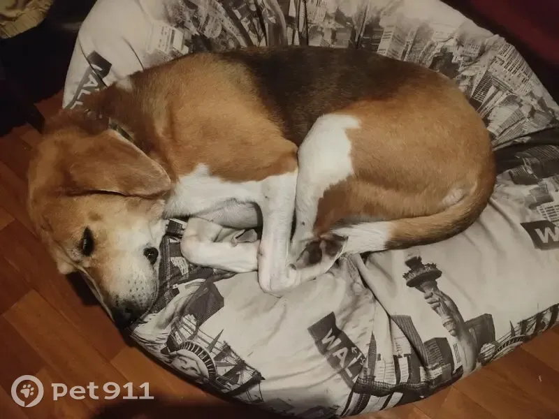 Русская пегая гончая. Морда немного седая, так как собака возрастная. Очень осторожная к людям, не агрессивная. Есть ошейник с адресником. Пожалуйста, звоните в любое время если увидели похожую собаку.
