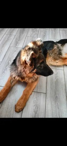 Немецкая овчарка, на собаке ошейник и отгрызенный поводок!