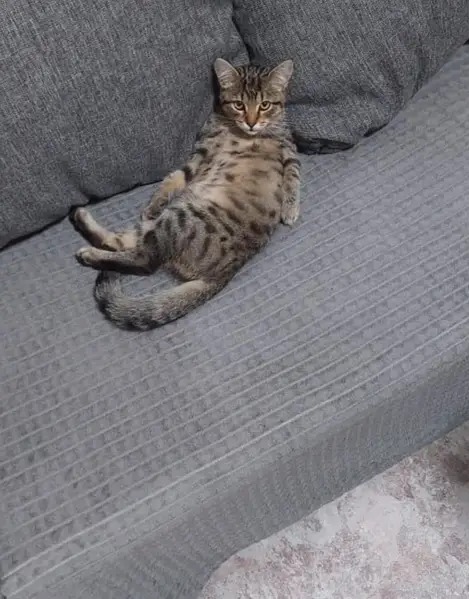 Молодая беременная кошка не старше года, серая в чёрное леопардовое пятнышко, ухоженная, хвост длинный, глаза косят к переносице, горшок знает, очень активная и не дружелюбная. Натуральную еду не знает, только корм. Найдена возле стадиона Картеп с. Миасское.