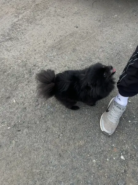 Коричневый, очень волосатый парень, ласковый, любит людей. На морде отчетлива видна седина на бороде и вокруг носа. На шее был одет розовый (резиновый) ошейник.