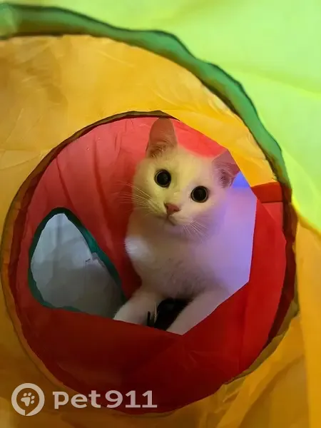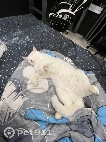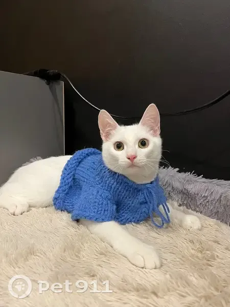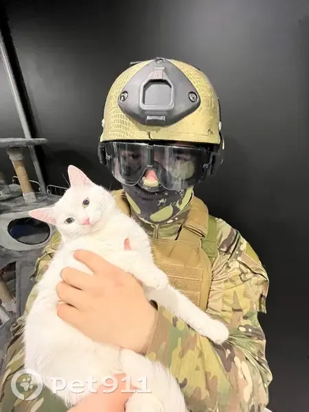 На лбу есть маленькое еле заметное черное пятнышко, Симба очень пугливый, чаще всего не мяукает, а муркает, котик полностью белый, вес 4500-4700, ему чуть меньше года