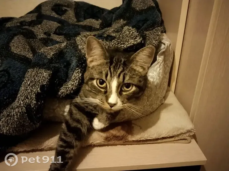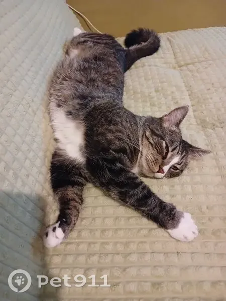 Выпал с балкона 21 апреля в 12.00-13.00.,Мира 21б. Кв.25 и убежал через двор за домом,как сказали дети,видевшие его.Он очень пугливый,домашний,кастрированый.Серый с чёрными полосками.Передние лапки у когтей белые,задние,одна лапа белая,другая белая на половину.Белый нагрудничек.На мордочке белая полоска и у носа белое.