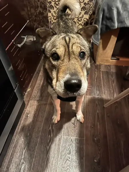 Я сегодня купила этой собачке колбасы и накормила её. Она лежала в магазине " северный градус",по улице Ломоносова (тот,что на перекрестке ул.Ломоносова и Строителей вроде как). Покушав, она направилась вниз. Сторона пляжа Ломоносовского.