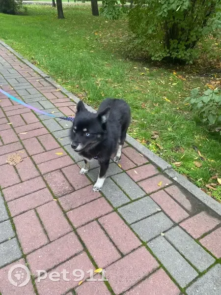 Маленькая чёрная собака с белыми лапками и голубыми глазами, очень похожа на хаски. На собаке фиолетовая шлейка и поводок. Очень пугливая, бриться людей. Вырвала поводок из рук и сбежала во время прогулки.