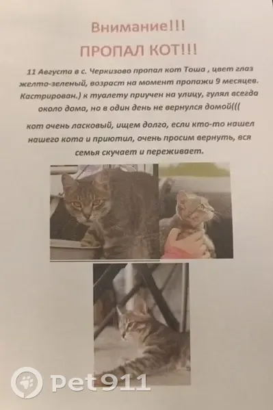 11 августа пропал кот, кастрирован, серый в полоску, цвет глаз желто-зеленый (больше зеленые) ручной, терпел абсолютно всё, тихий.
