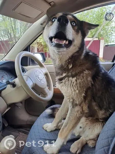 Окрас коричнево-черный с бежевым, около 7 лет. Хаски. Есть голубая бирка на ушке.