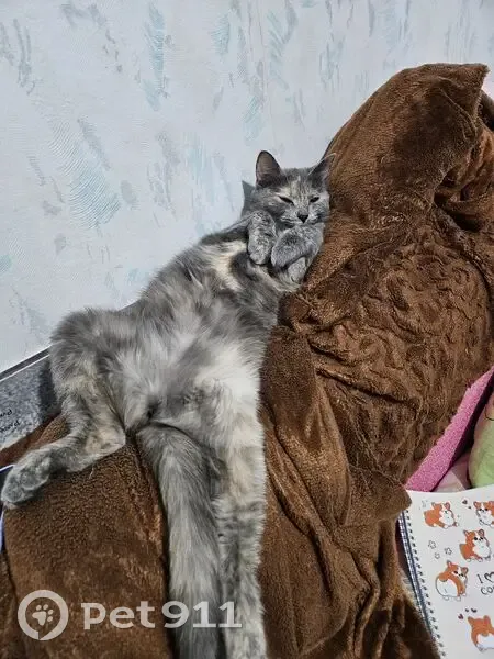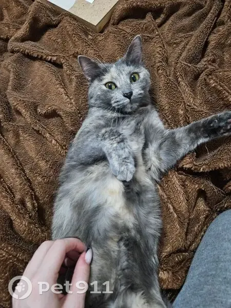 трехцветная кошка (больше серого), очень пугливая, хорошо отзывается на свое имя, недавно была стерелизована, возможно остались следы зеленки на животике