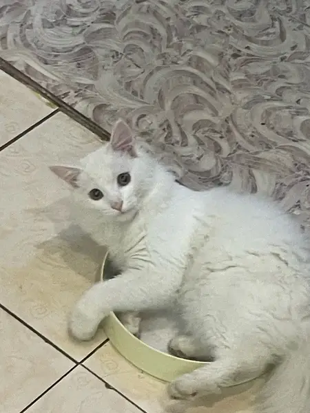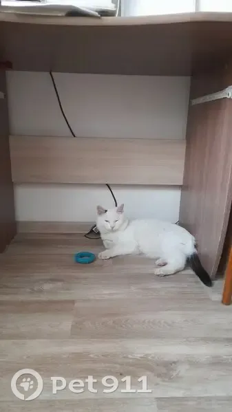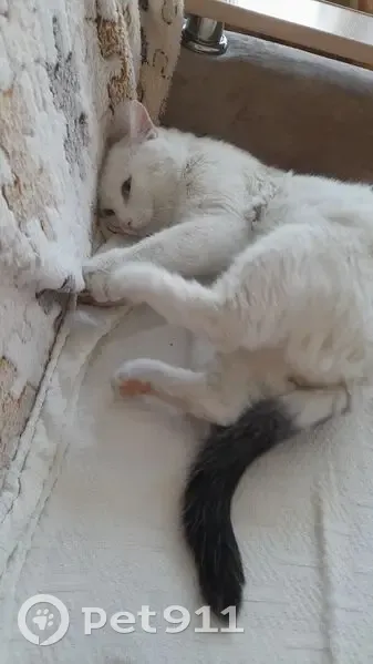 9 ноября,во дворе дома по ул.Анохина,около 20:00 нашли котика,Кот не кастрирован,белый с черным хвостиком.Очень контактный,ласковый,в лоток пошел сразу. Дома ведет себя спокойно. Ищем старых хозяев!