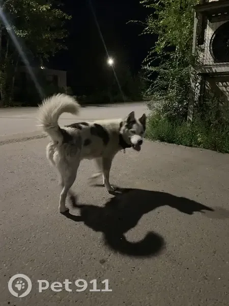 Собака была в ошейнике,на вид похожа на хаски,белого цвета в с черными пятнами,пол к сожелению не знаю.На вид не агрессивная,подозвали чтобы сфотографировать,но близко не подходила вроде не пугливая.