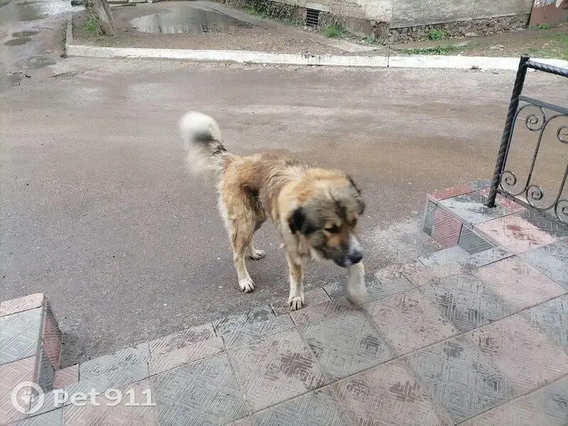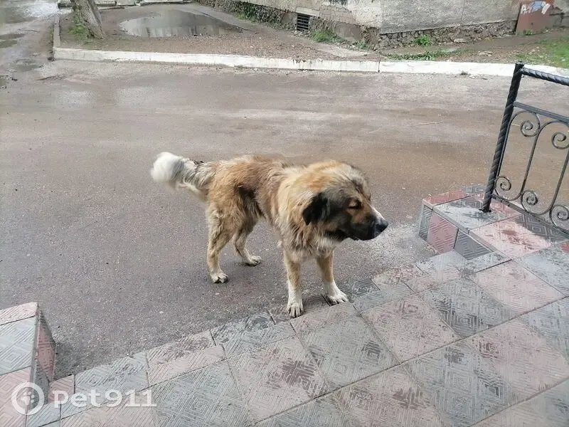 Собака огромная, похож на кавказца, по всей видимости на улице давно, очень худой, появился сегодня на пожарке, есть небольшие шрамы на морде, глаз один красный.