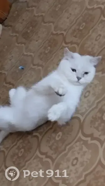 Британец в окрасе серебристой шиншиллы (белый с серыми кончиками шерсти). Подстрижен, кончик хвоста кисточкой. Возле глаза может быть чёрный след от жидкости глазной, болеет нужно капать.