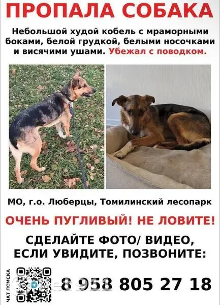 Пропала собака МО, г. О. Люберцы, пос. Мирный, ЖК Томилино Парк Небольшой худой кобель с мраморными боками, белой грудкой, белыми носочками и висячими ушами. Убежал с поводком. ОЧЕНЬ ПУГЛИВЫЙ! НЕ ЛОВИТЕ! ( худой, грязный, с поводком или без если перегрыз его) СФОТОГРАФИРУЙТЕ, СНИМИТЕ ВИДЕО, ПО-ВОЗМОЖНОСТИ ДЕРЖАТЬ СОБАКУ В ПОЛЕ ЗРЕНИЯ И СРАЗУ ЗВОНИТЕ: 89588052718 Чат поиска: https://t. Me/+TlNOXySqCtc1MmJi